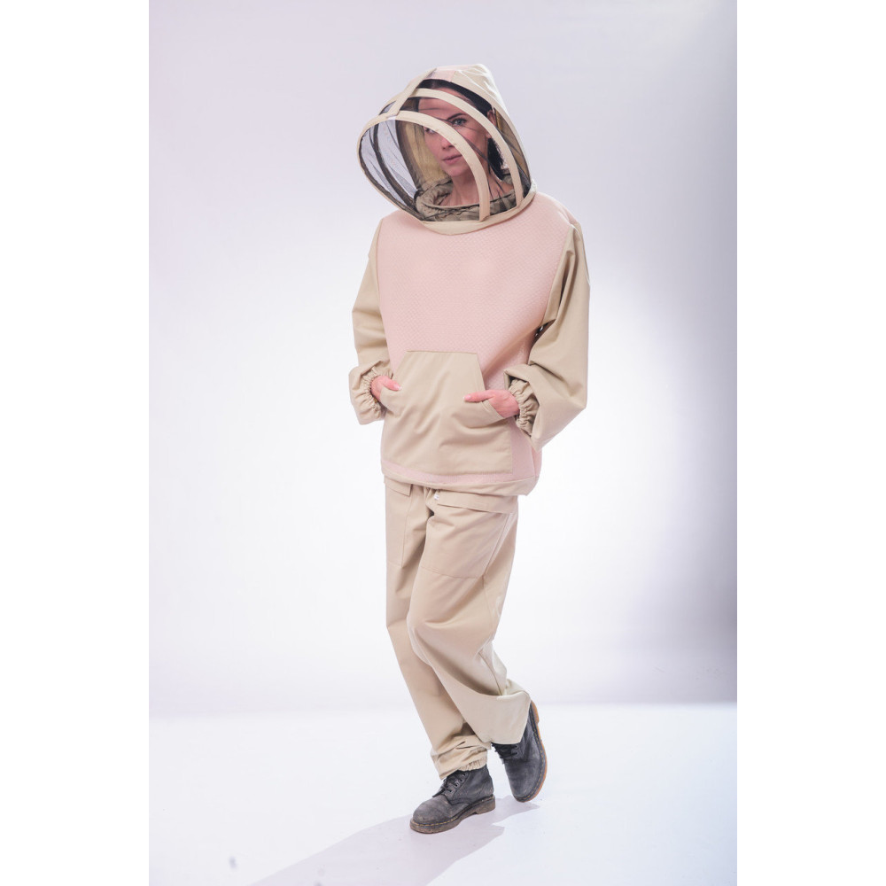 Striukė pasiūta derinant 3-4 mm tinklelį ir 100 proc. medvilnę. Toks santykis puikiai apsaugo nuo karščio, gerai vėdinasi, o svarbiausia dėka tinklelio storio apsaugo nuo bičių įkandimų, bitės geluonis nepasiekia kūno. Turi patogias kišenes. Rankovių ir kojų galai sutvirtinti guma. Kepurė-skafandras patogiai dedama tarp dviejų lankų ir gerai apsaugo kaklą bei galvą.  Striukė švelnios smėlio spalvos.